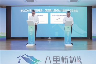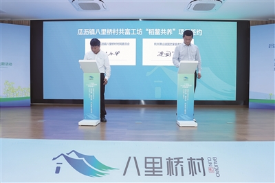 活动现场,八里桥村与萧山区市场监督管理局签署“萧山区市场监督管理局、瓜沥镇八里桥村共建联建项目”协议,与杭州萧山凌国文家庭农场签署“瓜沥镇八里桥村共富工坊‘稻鳖共养’项目”合作协议。萧山区“沙地农耕文化研学基地”揭牌落户。