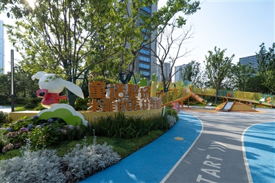 再往西,面积近700㎡的“儿童探索花园”将会承载孩子们欢声笑语。兔子主题的巨型攀爬活动区内,步梯、滑梯、爬网等排列组合,构建了一个连通地上的“空中”步道,秋千、摇摇乐等同样一应俱全。