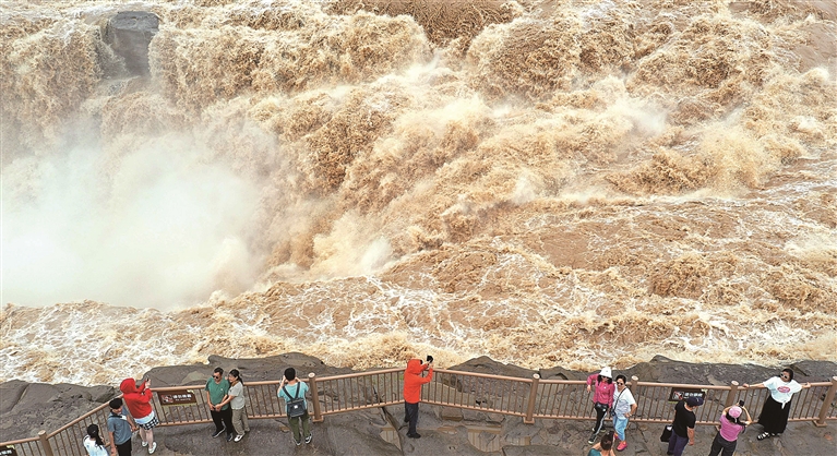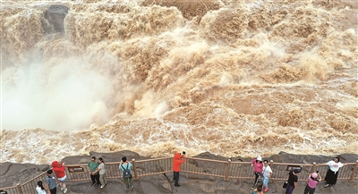 图为7月3日,游客在山西吉县观赏黄河壶口瀑布。