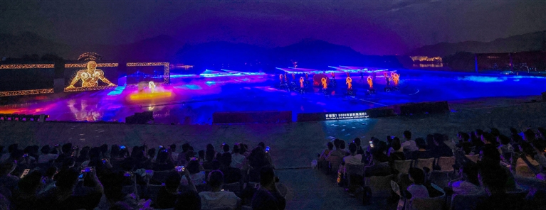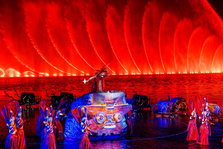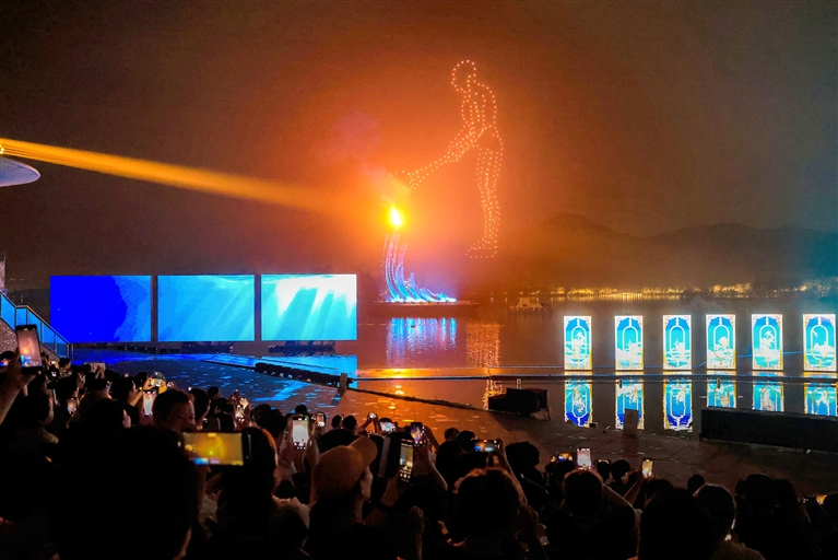 湘湖浪漫夜色中,这场“科技+文化”的视觉盛宴,借助全景升降倾斜机械舞台、多维数控激光喷泉、270度移动全息影像、全包裹式水火特效、空中无人机编队创意表演,呈现一个如梦如幻的艺术世界,让现场观众直呼“震撼”。