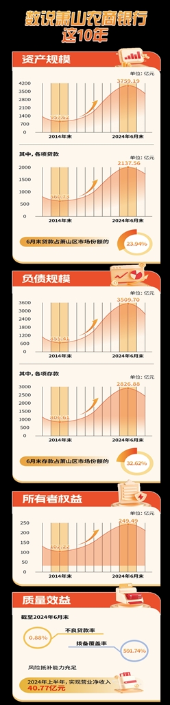 2024年是萧山农村信用合作社成立70周年、萧山农村合作银行成立20周年、萧山农商银行成立10周年。奋进不息,“潮”向未来。截至6月末,总资产超3700亿元,存贷款总额突破4900亿元,跻身“2024年全球银行1000强”榜单,位列第438名……这家“萧山人自己的银行”以奋进的姿态,汇入钱江潮涌,在波澜壮阔的经济发展画卷上,镌刻下金融为民的深深印记。