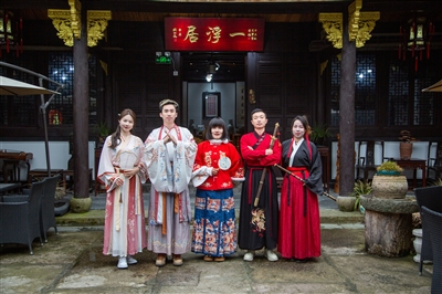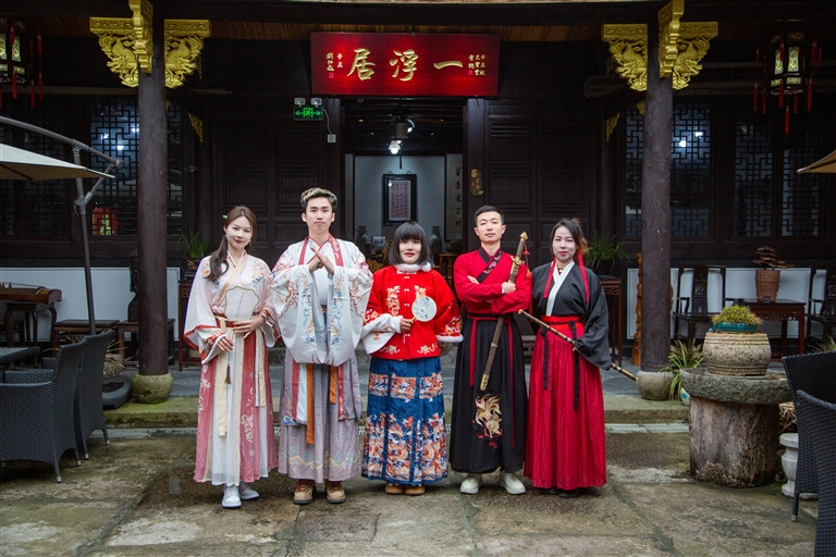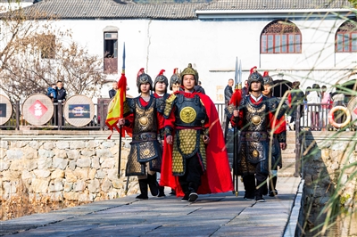 在进化,这样奇妙而和谐的“古今同框”并非个例。漫步太平桥村,一浮居、悬崖咖啡和露营基地等地随处可见身着汉服的少男少女。而在欢潭老街,时不时会迎面碰到身穿盔甲、手举长枪的忠义岳家军“NPC”,将旅游景点、历史古街、历史故事、民间传说以活态形式呈现,带给游客新奇的体验。