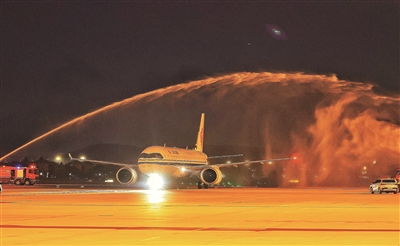 本报讯(首席记者 黄婷 记者 孔鹏飞 通讯员 施东杰)昨日18:30,杭州萧山国际机场迎来首个国产大飞机C919执飞的商业载客航班,从北京飞抵杭州的CA1722航班搭载150名旅客,缓缓穿过“水门”,滑入410机位。