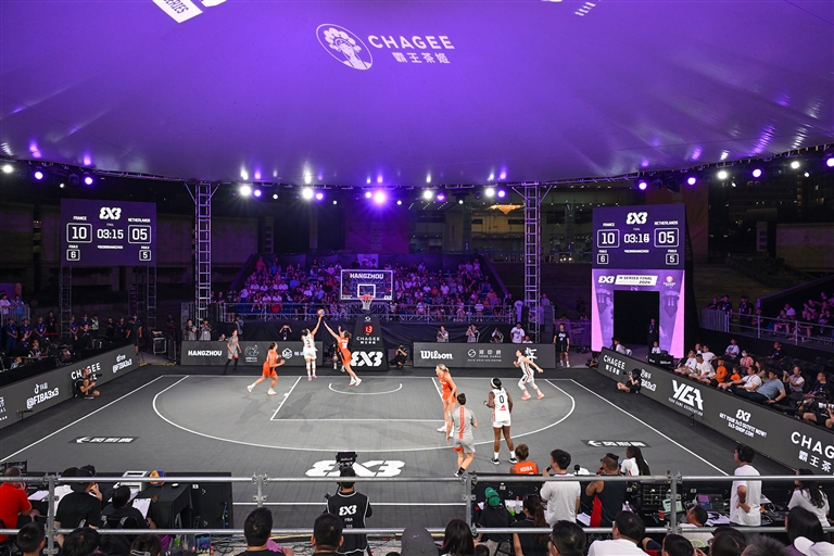 此次赛场设置在萧山文化广场,让更多的市民群众近距离感受了不同国家高水平篮球运动员竞技风采。