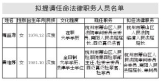 经研究,决定将杭州市萧山区人民法院提请杭州市萧山区人大常委会任命法律职务的 2 位同志予以公示,征求广大干部、群众的意见。现将有关事项通告如下:
