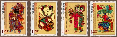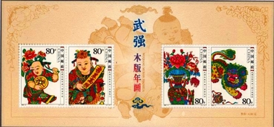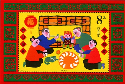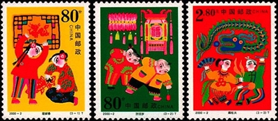 非物质文化遗产是中华文化的瑰宝, 经过几千年的传承和变迁,春节积淀了十分丰富的习俗活动和文化内涵。2000年1月29日(腊月廿三),中国邮政发行了《春节》特种邮票一套3枚(图1),小型张1枚(图2),图案分别为“迎新春”“辞旧岁”和“闹社火”,小型张为“合家欢乐”。该套邮票借鉴了民间年画、剪纸等艺术形式,描绘出春节文化活动中贴窗花、放鞭炮、点花灯、舞长龙、扭秧歌、合家团圆的喜庆场面,表达了人们对春节的热爱和对美好生活的期盼。