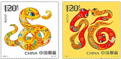 生肖邮票是中华民族悠久灿烂的民族文化结晶,作为全年邮票发行的“开门票”,一直备受集邮爱好者追捧。中国邮政10月30日发布《乙巳年》特种邮票图稿(图3),该套邮票将于2025年1月5日发行。第一枚“蛇呈丰稔”。邮票画面为金色的蛇躯蜿蜒,口中衔着一束“嘉禾”,象征着“仓廪实,衣食足”的美好图景。蛇身金光熠熠,与璀璨的麦穗交相辉映,仿佛绘就了一幅丰收时节金光灿烂、富饶满溢的画卷,寓意着风调雨顺之年,五谷丰登之景,以及国泰民安的盛世祥和;