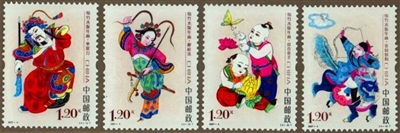 中国邮政从2015年至2019年连续发行了五组“拜年”系列邮票。其中,第一组《拜年》邮票于 2015年1月10日发行,邮票画面以其独特的卡通风格和浓郁的民俗特色,展现了人们过大年,拜大年时的喜悦场景。第二组《拜年》邮票于2016年1月10日发行,邮票图案为“欢欢”戴着“猴帽”双手高举竹竿燃放鞭炮喜庆新年的场景。第三组《拜年》邮票于2017年1月10日发行,邮票图案为两位身着蒙古族服饰的可爱儿童“欢欢”和“喜喜”,手捧哈达向全国各族人民拜年。第四组《拜年》邮票于2018年1月10日发行,邮票画面展现了壮家人过年时热情好客的场景。第五组《拜年》邮票于2019年1月10日发行,邮票图案表现了“欢欢”和“喜喜”身着藏族传统服饰向全国各族人民拜年,两侧印有“雪月冰星春酒暖,吉祥兴旺彩云飞”的春联,整个画面轻松愉悦,洋溢着新年的喜庆气氛。