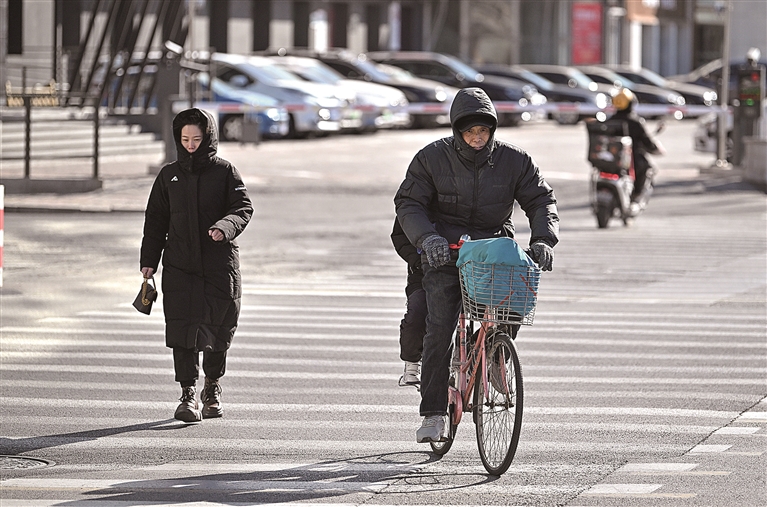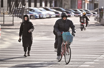 图为2月7日,在天津市南开区,市民在大风中出行。