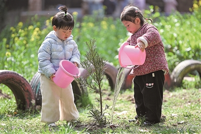植树节即将来临,各地开展植树活动,为春天增绿添彩。图为3月11日,江苏省南京市建邺区金地名京幼儿园的孩子们在校园里为树苗浇水。