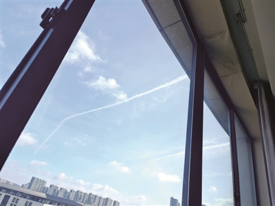 | @原来那个人 今天这个飞机云都快90度角了! 感觉挺少见的,直条的倒很多,可能是角度问题吧。 |