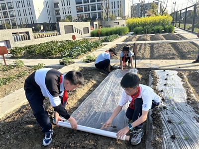3月27日,新一季农作物开种了。502班的同学们,来到菜地里种起了黄瓜和番茄。同学们有的拔草,有的锄地,有的种苗,有的浇水,一个个干得热火朝天。他们在技术指导员汪老师的带领下为菜地铺上了地膜,后期还准备给蔬菜搭棚。504班计划种植秋葵和花生,同学们提前把土地都翻了一遍,然后分头寻找种苗,等准备好小苗就可以种植了。405班的同学们打算种植番薯,只等4月中旬播种的时间一到,他们班的承包地里也要忙活起来了。
