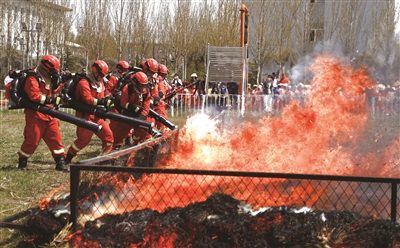 图为5月9日,在黑龙江省大庆市,国家消防救援局大庆航空救援支队的消防员向人们演示班组灭火作业。