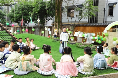 “老师,你看,小草在写诗呢——野火烧不尽,春风吹又生!”近日,在机关幼儿园的草坪上,一个穿着汉服的小男孩指着满地的小草兴奋地喊道。在他身后,一群“小诗人”正忙着用橡皮泥捏出“举杯邀明月”的酒盏,用纸筒“望远镜”寻找“李白的云”“苏轼的树”,他们把整个幼儿园变成了一个会“写诗”的童话王国。