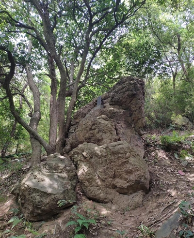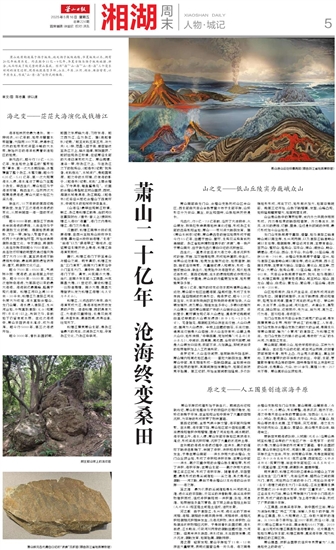 距今2亿年,强烈的印支运动亦即所谓燕山造山运动,萧山部分地区出露海面,隆起成陆,形成了北东走向、隆陷相间的构造形态。晚侏罗纪,距今1.37亿年左右,太平洋板块向欧亚板块俯冲速度加快,火山喷发强烈,波及萧山,相继发生多中心、多喷口的强烈火山爆发,组成萧山南部广布的火山岩低山丘陵。资料显示,戴村镇发现亿年火山遗址,属侏罗纪晚期或白垩纪早期的火山喷发遗存(距今1亿~1.2亿年前)。笔者拙见,湘湖越王城山存在流纹岩、火山口遗迹,揣测为火山遗存。半坡上出露的岩石,系流纹岩,通常流纹岩是火山熔岩,与火山活动有关;山巅上是火山口,地形独特,“中卑四高,宛如城堞”(明嘉靖《萧山县志》),中间低,四周高,周边圆,俗称仰天田螺,疑是火山喷发口旧貌;底部不深,浅如碟盏,抑或被后续的地层堆积加上人工改造所致。