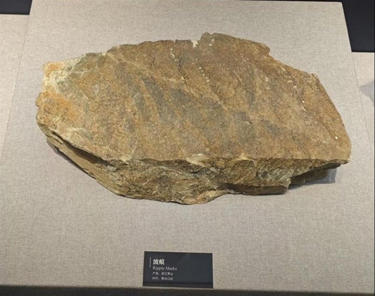 元古代,约9亿~7.8亿年前,经历了大洋俯冲、火山喷发、板块拉张伸展等地质演化过程,形成浙江北部的古岛弧和盆地,萧山——球川深大断裂发育。据《萧山水利志》记载,萧山最古老的岩石地层形成于距今约8.5亿年,出露于岩山、管村、北坞双溪坞背斜构造轴部。浙江省地质博物馆展示的“波痕”,是一块产于萧山南片、出于新元古代青白口纪的沉积岩石。