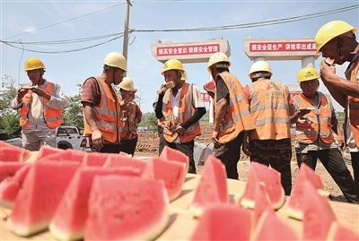 图为7月3日,在山东省临沂市沂南县铜井镇董梁高速第四标段施工现场,工人们在休息区吃西瓜解暑。