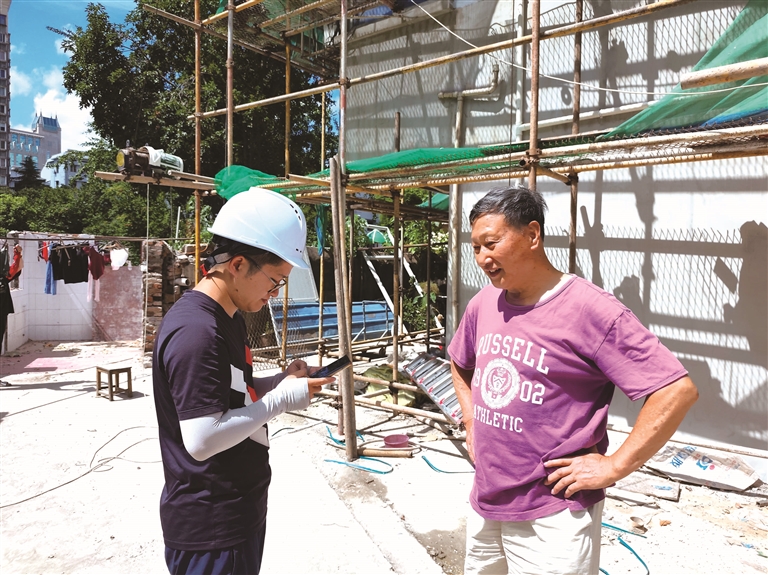 “小施,你来啦!你进来看看,二楼的阳台拆除后,我们家客厅墙壁上出现了渗漏,你得帮忙想想办法。”居民赵师傅叫住小施。“好的,你不要着急,我先看看。”施橙锋低头钻过脚手架,走进赵师傅家的客厅。他拿出手机拍下现场的情况,并记下赵师傅的电话号码,便于后续沟通。