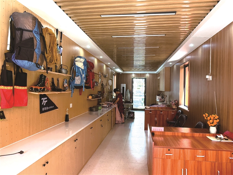 经过几个月的装修改造,“良木集”全新亮相。之前的老旧面貌不复存在,服务场景融合了登山活力阵地与便民服务工位。便民服务仍旧集合了小家电维修、缝纫和钟表维修等,各工位有序排列。剩余的空间则借助途非途户外运动品牌资源,打造成登山驿站,按营地运动风格的场景进行布置,将登山杖、登山包等户外用品上墙,登山活动照片同框展示,充分提升了空间的可观赏性。由此,这里也成为俊良社区西山登山队伍的孵化阵地,是登山活动的集合打卡点。