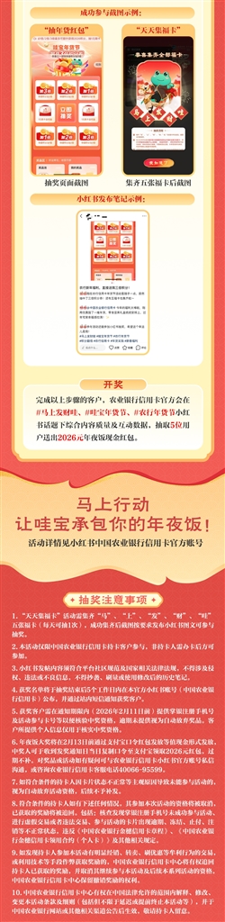 完成以上步骤的客户,农业银行信用卡官方会在#马上发财哇、#哇宝年货节、#农行年货节小红书话题下综合内容质量及互动数据,抽取5位用户送出2026元年夜饭现金红包。