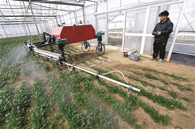 图为2月15日,在浙江省嘉兴市南湖区凤桥镇一个有机农业园的蔬菜大棚内,工作人员遥控操作植保机器人进行施肥作业。该农业园配备数字化智慧农业系统,引进农业机器人进行施肥、浇水、翻耕、播种、植保等农事工作。
