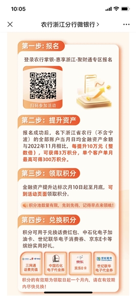 报名成功后,名下浙江省农行(不含宁波)的全部账户当月日均金融资产余额与2022年11月相比,每提升10万元(整数倍),可获得3万积分,单个客户单月最高可得300万积分。