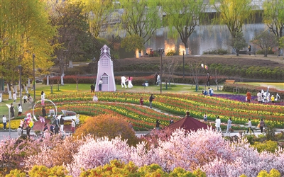 这几天气温明显回升,南江公园8万株各色郁金香全面盛开,吸引了众多市民、游客前来观赏打卡。图为昨日傍晚市民赏花场景。 记者 丁力 周煜程 摄