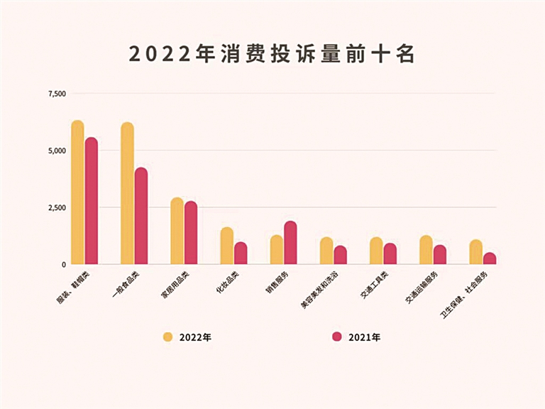 全年投诉量排名前十位的是:服装鞋帽类、一般食品类、家居用品类、餐饮和住宿服务、化妆品类、销售服务、美容美发和洗浴、交通工具类、交通运输服务、卫生保健、社会服务。与2021年相比,由于总投诉量上升,每类投诉均有不同程度的上升。前十类投诉量占总投诉量的65.44%。