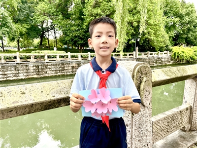 回澜小学301班的俞思辰平时就喜欢用日记记录身边的事。这次,他不仅写了一首《在九月》的小诗,还把这首诗用朗诵的方式录制下来,在教师节当天送给了所有教过他的老师。这是一首童真和灵气并存的小诗,把藏着秘密的露珠、飘着故事的云朵、写满祝福的落叶以及藏着回忆的桂花都化作期盼,送给亲爱的老师。虽然朗诵的时候,声音有些稚嫩,但还是能被诗中的真挚情感打动。教师节这天,当聆听到这首诗时,老师们不禁点赞:“这首诗不但天真有趣,还无比温暖,藏着孩子心中那份最柔软的情感。”就是这么一首温柔的小诗,让老师们的内心被甜到了。此外,他还用心制作了一朵粉色的立体花,希望老师们听着甜甜的诗,每天的心情都能像花儿一样美丽。
