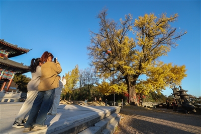 图为11月21日,游客在观赏拍摄诸暨市店口镇杭坞山顶的古银杏树。