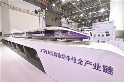 车头似鹰隼,身披虹韵紫,轨道交通馆的“重量级大咖”——复兴号亚运智能动车组1:10模型,静静陈列在展台,让人眼前一亮。