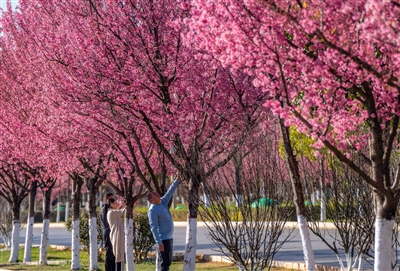 近日,云南省昆明市阳光明媚,气候宜人。市区的冬樱花绚烂绽放,吸引众多市民和游客驻足观赏,拍照留念。