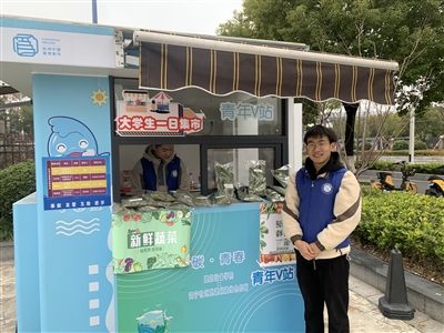 “电气23班清波园劳动耕种荣誉出品”“给排水23班慧耕菜地荣誉出品”……一包包贴有“劳动者”标贴的绿油油新鲜菠菜整整齐齐地码放在“碳·青春”青年V站的窗口,吸引了众多附近的居民前来询问和采买。