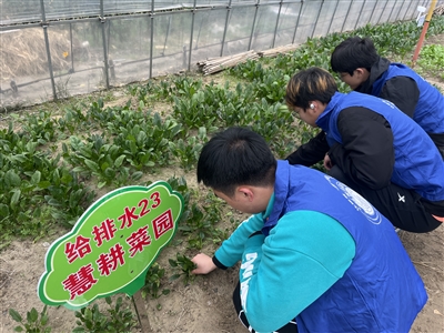 “我们耕种的菠菜绿色无污染、低碳不施肥。百草园劳动基地共17块责任田,种有各类中药草、蔬菜、水果等十多种作物。过几天基地里的青菜也可以丰收了!”建筑设备学院的学生热心地向前来买菜的鸿宁社区居民介绍道。