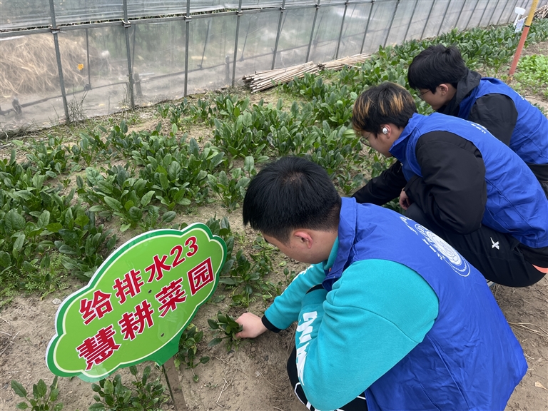 介绍中所提及的百草园是指鸿宁社区党支部携手浙江建设职业技术学院建筑设备学院党总支,共同开展的党建联建项目——“一鉴开”百草园劳动实践基地。近日,基地中种植的菠菜大丰收,大学生们忙个不停,采摘、挑选、清洗,一株株菠菜被分装成袋在“碳·青春”青年V站公益售卖。
