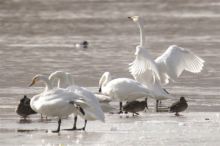 近日,在甘肃省兰州市西固区达川镇境内的三河口天鹅滩,多只天鹅在此栖息越冬。三河口是黄河、湟水河、大通河的汇流之处,近年来,当地着力推动黄河流域综合治理,生态环境持续向好,为候鸟提供栖息地。