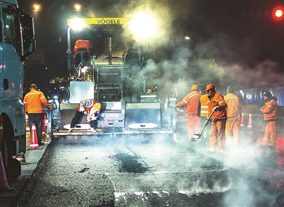 春节临近,萧山交投下属路桥工程公司利用晚上的时间,对车流量大的道路病害路段进行应急修复。图为施工人员深夜在靖江街道的青六线与伟老线路口施工。 通讯员 王浩 摄