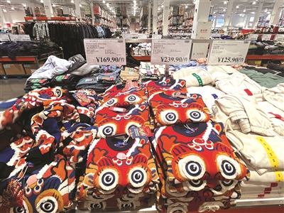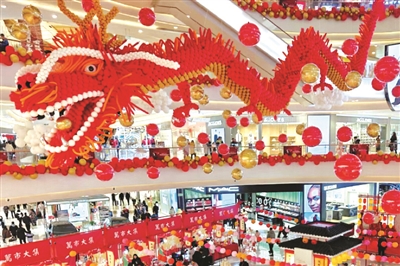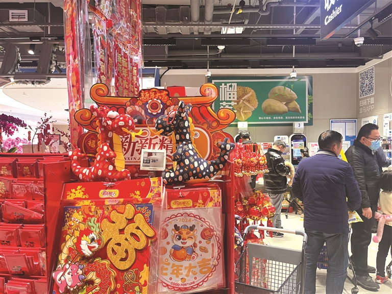 在盒马鲜生、山姆等大型商超,金红配色的横幅早就高高挂起。一进超市,招财纳福的龙对联、龙窗花、龙灯笼等家装饰品格外醒目;零食区,“龙年有鱼”锅巴鱼皮礼包做成了手拎鱼的样式,乐事薯片包装上的卡通金龙流光溢彩;家居区,红彤彤的秋衣秋裤补货不停;还有各种“金龙送福”红烧肉、“龙驹凤雏”烤鸡、“龙情盛意”坚果的礼盒……