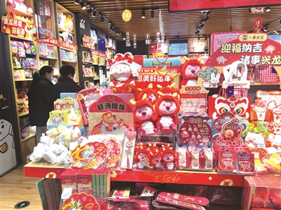 此外,各类创意文创、玩偶销售也极为火热。呆萌可爱的小龙玩偶,抱着锦鲤的lulu猪,龙年限定虎头帽公仔,龙年赞萌露比已经预定了今年年货顶流,还有棉花娃娃的“小龙女”限定装扮……各类带有龙元素的玩偶成功吸引住小朋友的目光,市民刘先生就给自己3岁的宝宝买了龙头帽公仔,给14岁的侄女买了龙年文创产品。