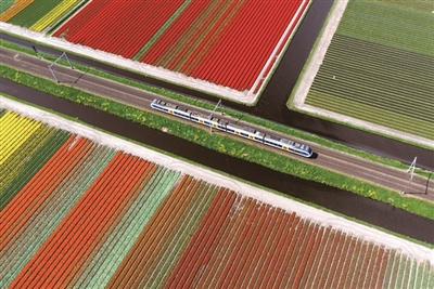 荷兰是全球最大的郁金香出口国。每年3月中旬到5月中旬是荷兰传统的郁金香花季,五彩斑斓的郁金香花田吸引世界各地游客。 图为4月14日在荷兰利瑟拍摄的郁金香花田。 (本版图文均据新华社)