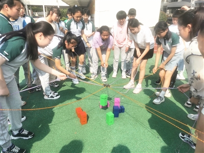 六年级孩子们携手合作,用一根根纤细的线,共同编织出一座座挺拔的高塔。他们每十人为一队,手持一根绳子,通过相互配合和拉扯,将一个个积木堆上去,建成一座座高塔。每一次拉扯、每一个结点都考验着孩子们的默契与创造。塔的每一层,都承载着孩子们的想象与勇气,每一寸高度,都凝聚着他们的努力与坚持。