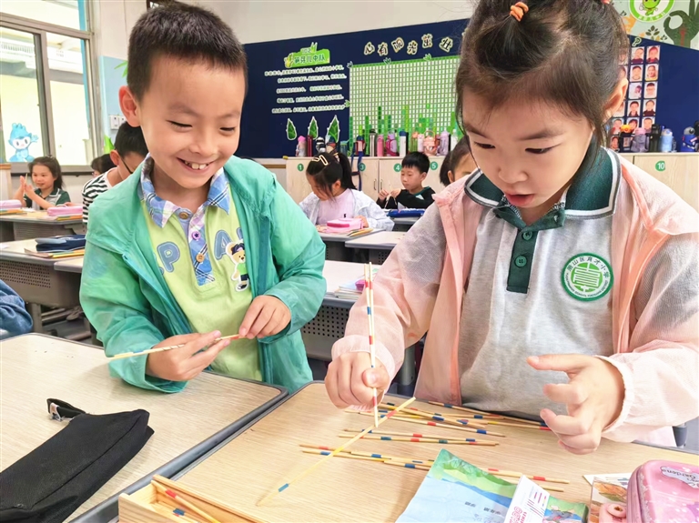 除了操场上的欢乐,课间活动也是五花八门。“翻花绳”“挑小棒”“变脸魔方”“抓石子”……当这些“童年玩具”出现在孩子们的手中,似乎也玩出了不同的味道,甚至还产生了新意。手是忙碌的,眼睛是专注的,嘴角是上扬的,快乐,就是如此简单的。
