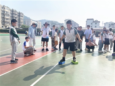 校园的操场上,阳光洒下斑斑点点的光晕,五年级的“过河拆桥”活动热闹展开。孩子们被鼓励发挥个人创造力,独立思考,运用想象力策划出独一无二的“过河”方案。有手脚并用放置“过桥石”的,有利用“过桥石”来滑行的,还有手抓“过桥石”走螃蟹步的……每一次尝试都是对创意的一次挑战,每一次成功都是对自己的一次肯定。