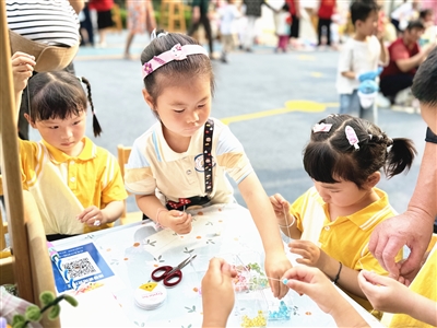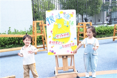 活动现场,随着老师们的一声“开始”,幼儿园瞬间变身成热闹的“集市”。吆喝声、欢笑声、音乐声在园内四溢。可爱童趣的海报、富有特色的摊位招牌、琳琅满目的手工艺品……“小老板”们在认真摆好自己的摊位后,有模有样地向路过的小顾客推销商品。“走过路过,来看看限量版玩具”“这朵向日葵是幼儿园的园花,要不要来一朵?”“买这礼物回家,送给爸爸妈妈肯定开心!”……叫卖声此起彼伏,不少“小老板”还推出各种大减价等特惠活动,吸引小顾客的到来。