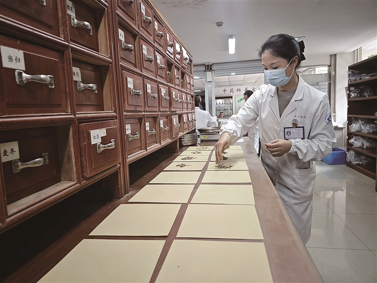 29日上午9点多,区一医院中药房工作人员就已经忙开了。桌上一张张包药纸上放着称好的药材:乌梅、山楂、陈皮……工作人员手脚麻利,快速将药材包成了一个个小包裹。