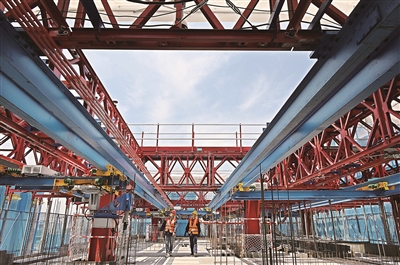 图为5月29日,技术人员在“天蝉”住宅施工机器人内部巡查。