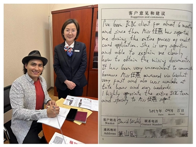 近期,一位德国籍客户来到工行萧山江南支行,咨询办理信用卡业务。经沟通,该客户刚到中国3个月,目前在银行附近学校工作,且为工行代发工资客户。他想申请工行信用卡,方便日常消费。根据规定,外籍客户办理信用卡需满足在国内居住满6个月的要求。于是客户经理与其互添微信,并在后期不断提供咨询服务。近日,客户应约再次前来申请工行信用卡并成功办理。他对银行的服务非常满意,写下满满一页的表扬信。