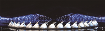 随着夜幕降临,舞台灯光亮起,巨大的屏幕上出现了“数智人”的身影,瞬间唤醒了观众们的亚运记忆。可升降的圆形主舞台上,舞者们穿梭而过,伴随着多维数控激光喷泉的炫目效果、全包裹式水火特效等,每一幕都像是一幅生动的画卷,让人仿佛置身于千年历史的长河之中。