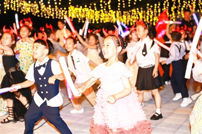 夜幕降临时,热闹的篝火狂欢夜开始了。吃一口美味,闻一缕香甜,满满都是幼儿园幸福的味道。看着老师们准备的一盘盘美味佳肴,孩子们兴奋地品尝起来,整个进餐环节自主有序,体现了孩子们文明用餐的礼仪。享用完美食,孩子们手握荧光棒,头戴彩灯发饰,将黑夜里的操场瞬间装扮得美丽极了。热烈的“火焰”、动感的音乐、欢快的舞蹈、开心的笑脸,每个童年的梦想都被点燃,美好的未来正在向他们招手。“我舍不得你,你是我最好的朋友”“谢谢王老师,我会永远记得您”“我爱幼儿园,我们以后要常来看看”……孩子们分享着自己的快乐和喜悦,表达着自己的感激和依恋,那一刻,大家的心紧紧贴在一起。