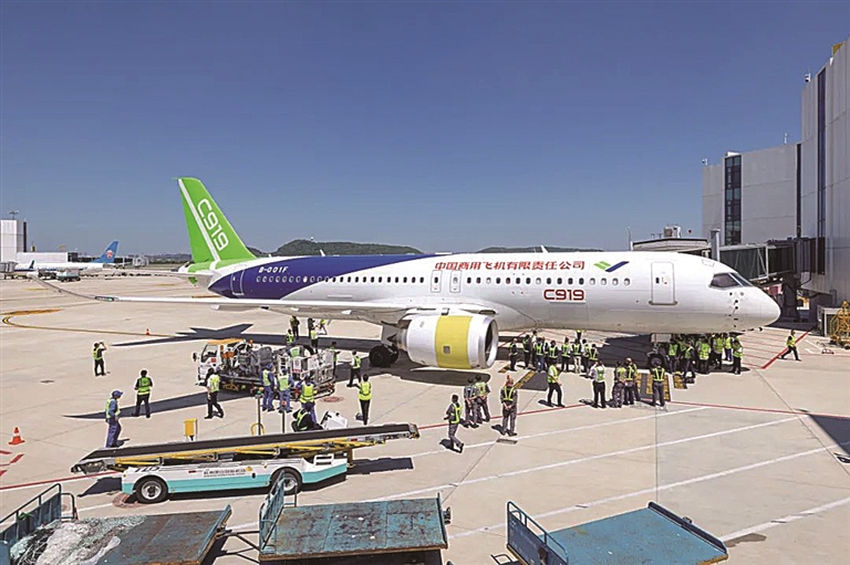 C919是我国首款按照最新国际适航标准生产、具有自主知识产权的单通道大型干线飞机,最大容量为190名乘客,最大航程为5555公里。目前,C919已在北京、上海、广州、成都等地的多条航线上实现商业飞行。